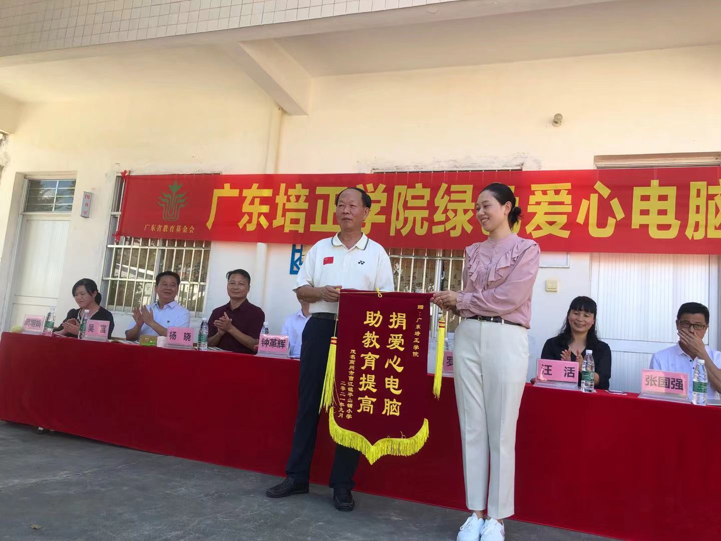 廣東省教育基金會鄭熾欽副理事長兼秘書長向廣東培正學院贈送錦旗,請廣東培正學院資產管理辦公室資產管理員羅慧接收錦旗。