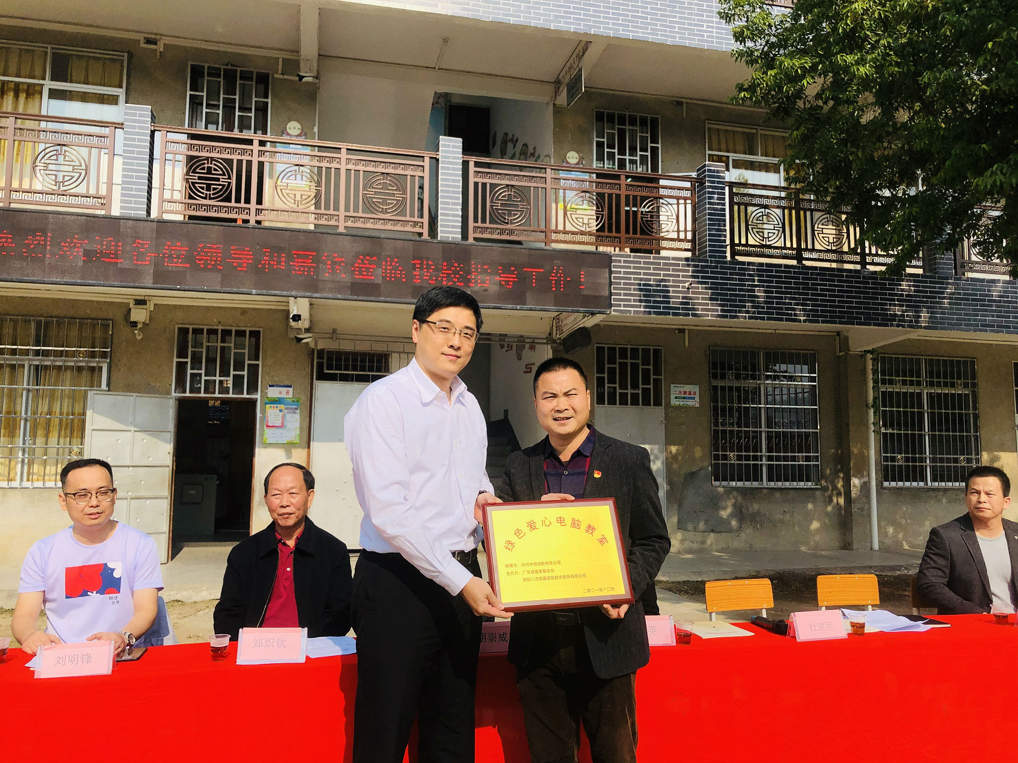 時代中國控股有限公司信息化平臺管理中心胡崇威總經理向寨崗鎮中心小學贈送“綠色愛心電腦教室”牌匾,杜建民校長接收牌匾