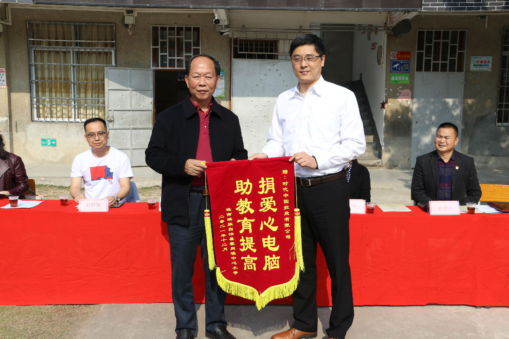 廣東省教育基金會鄭熾欽秘書長向時代中國控股有限公司贈送錦旗,時代中國控股有限公司信息化平臺管理中心胡崇威總經理接收錦旗