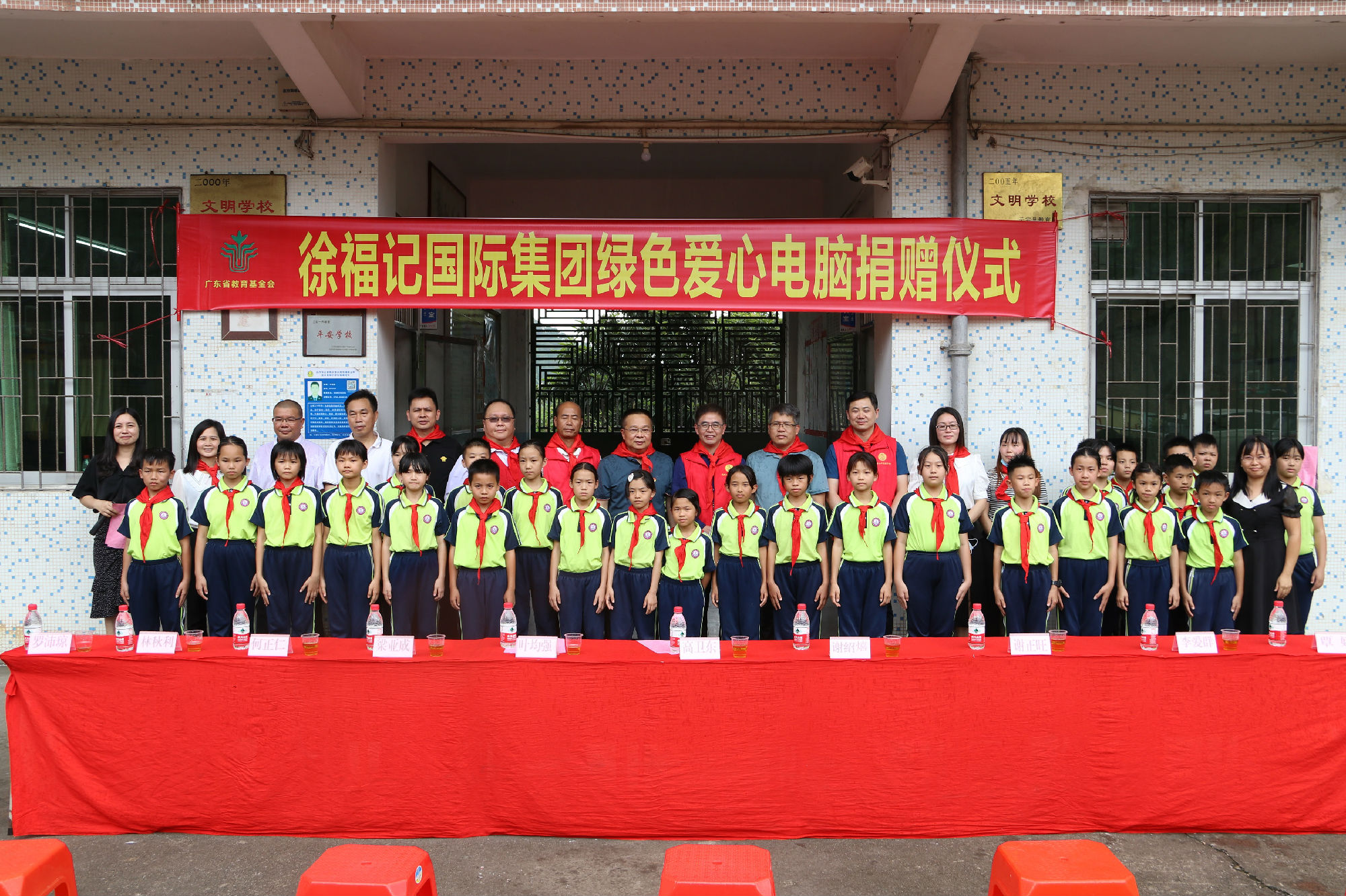 徐福記國際集團大區(qū)謝正旺總經(jīng)理向留洞小學贈送“綠色愛心電腦教室”牌匾,留洞小學羅沛瓊校長接收牌匾